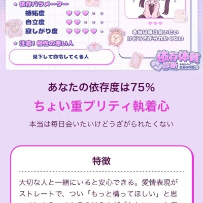 最近〇〇診断みたいなんにはまってて 今日は依存体質診断やってみた︎😺 確かにこの通りかも!! 本当は毎日会いたいけど言い難いんで みなさん自分から会いに来てくれると 嬉しいですとっても…