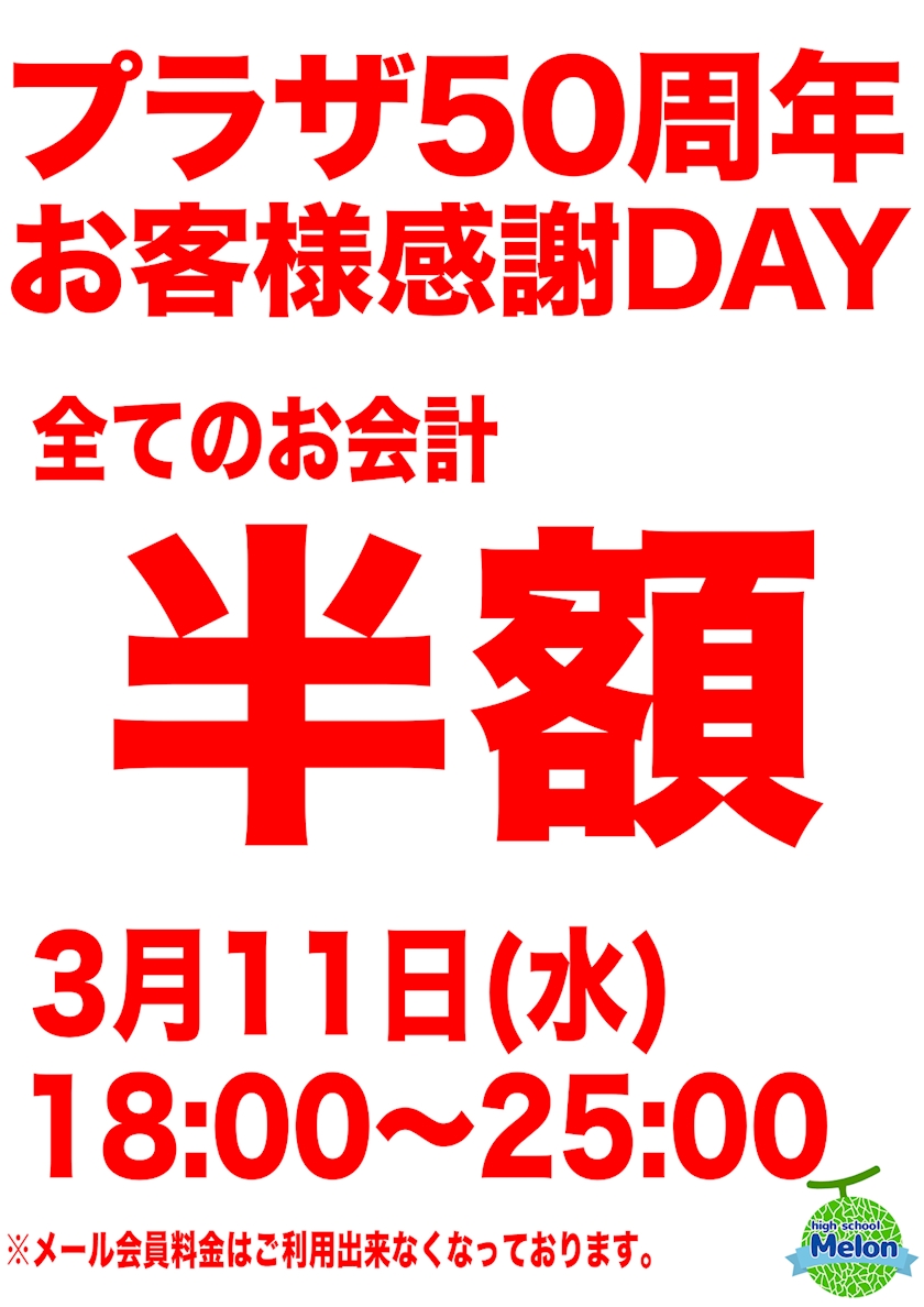 3/11(水)プラザ50周年お客様感謝DAY【オール半額】